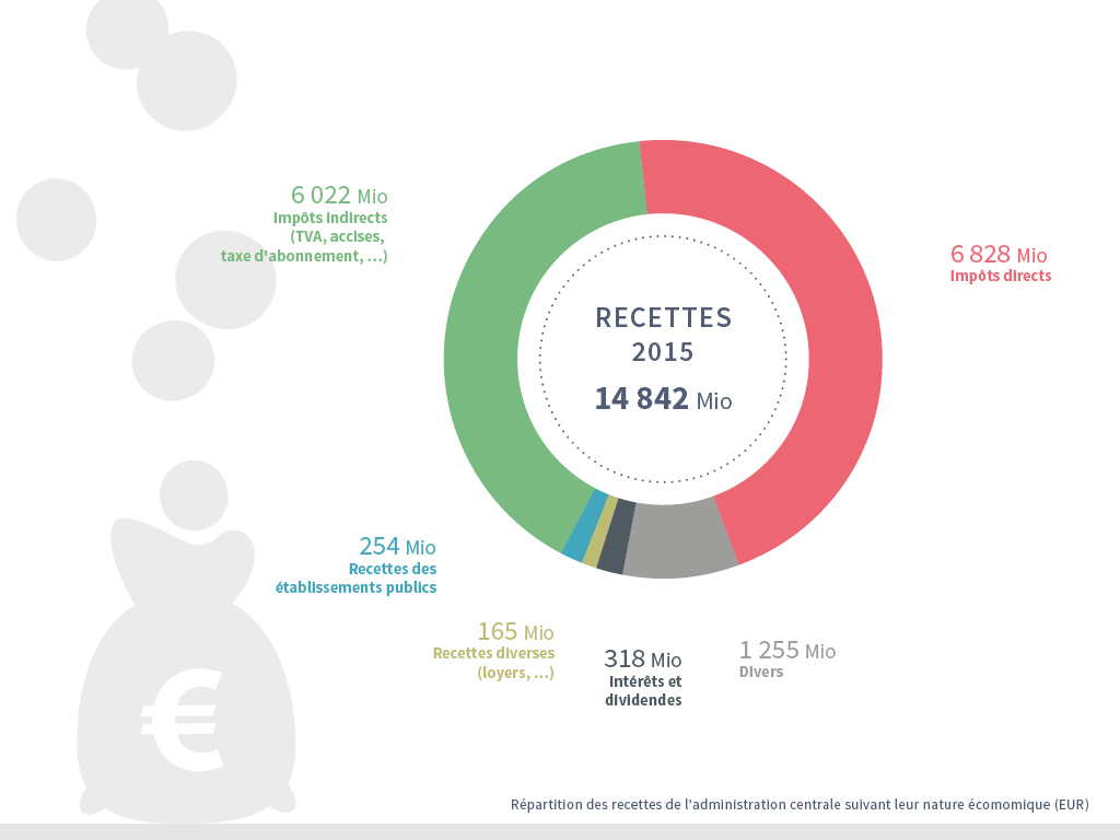 2015 wäerten eis Recetten op den direkte Steieren ëm 7,5% op 6,7 Milliarden eropgoen. Deen Trend gëtt haaptsächlech gedriwwe vun der Lounsteier, vun där mer méi erakréien, well weider nei Aarbechtsplazen entstinn, an d'Peien och rëm lues unzéien.