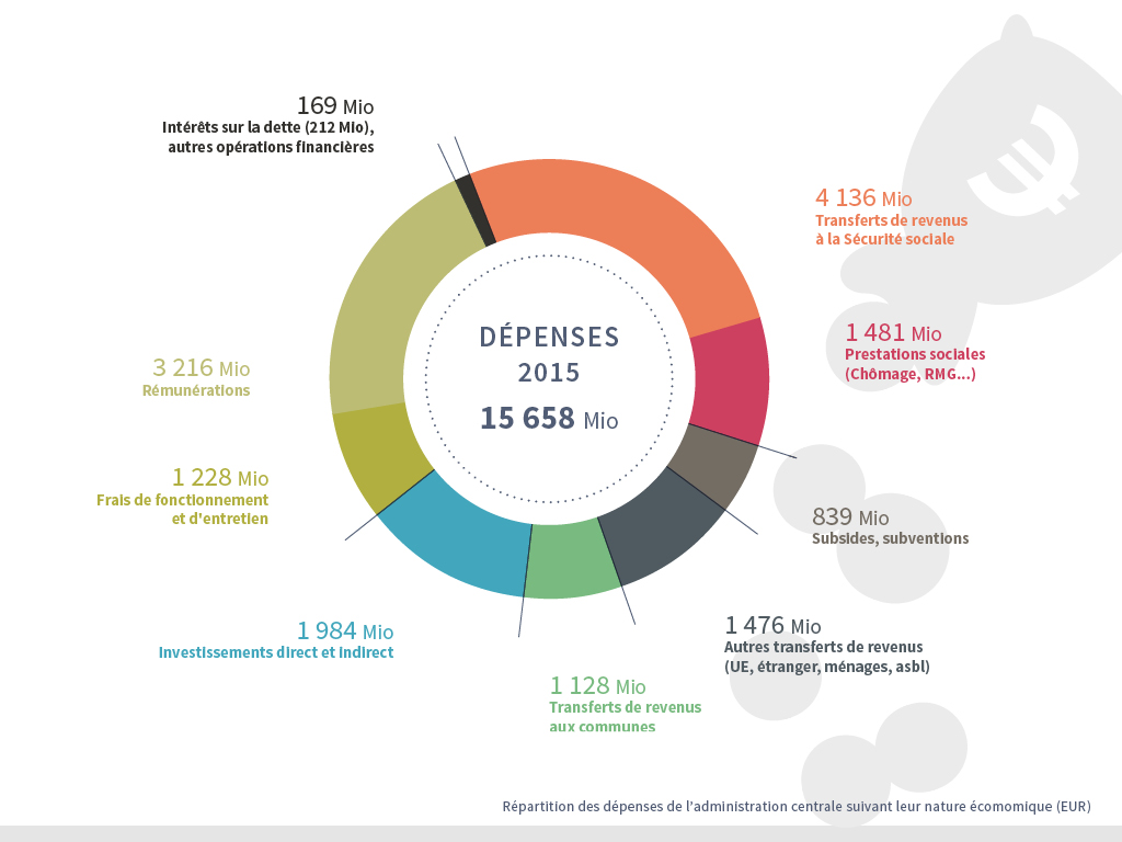 Eise Budget huet eng staark sozial Komponent. Bal d’Halschent vun eisen Depensen sinn Transferten un d’Sécurité sociale, sozial Leeschtungen, Subsiden, asw.
