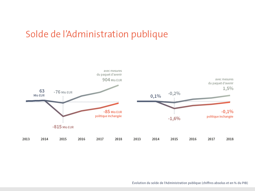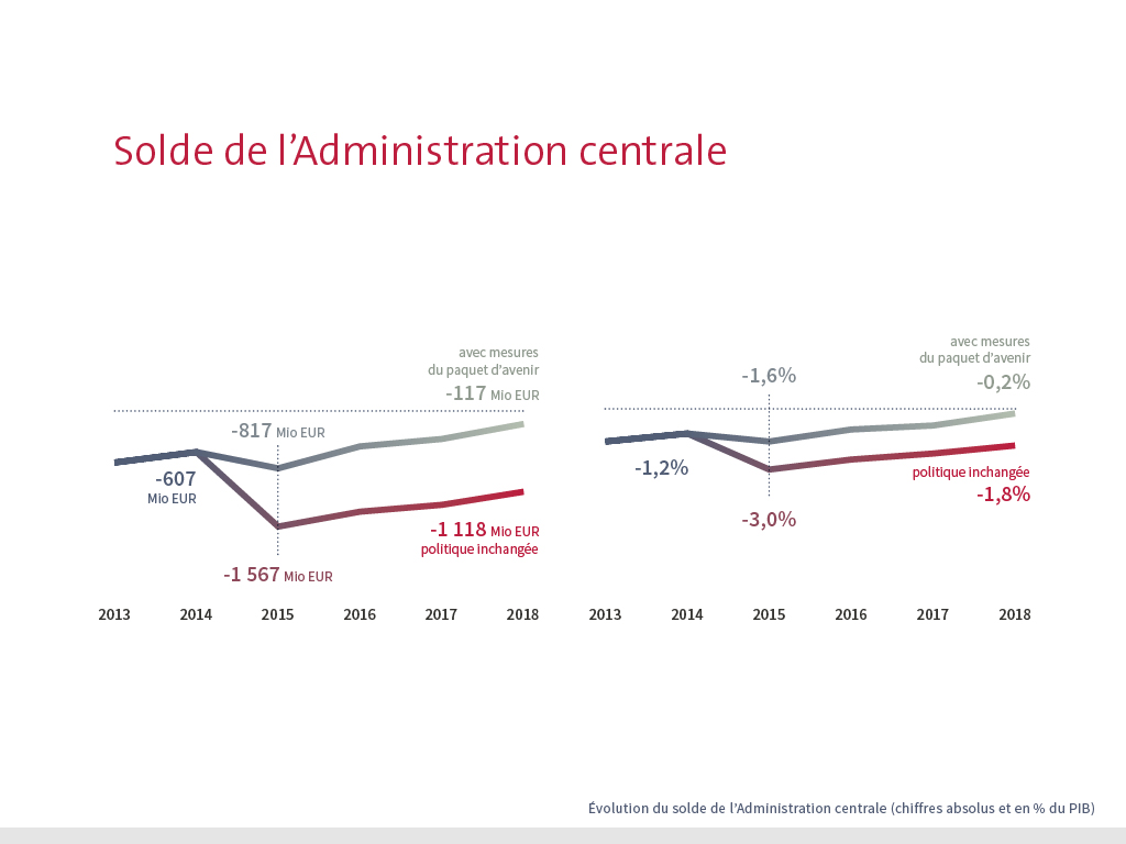 Mat eisem Zukunftspak hu mer et fäerdeg bruecht, den Defizit vun der Administration centrale, vun 1.567 Milliounen, wou mer 2015 gelant wäre, wa mer näischt gemaach hätten, op 816,6 Milliounen erofzebréngen. Domadder hu mer den Defizit quasi halbéiert.