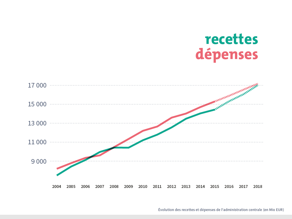 Wann een d'Recetten an d'Depensen niewentenee kuckt, da gesäit een, dass kuerzfristeg d'Schéier tëscht deem wat mer erakréien, an deem wat mer ausgi rëm ausernee geet. Méi laangfristeg gesinn, si mer awer um richtege Wee. Bis 2018 kréie mer déi Schéier rëm zesummen.