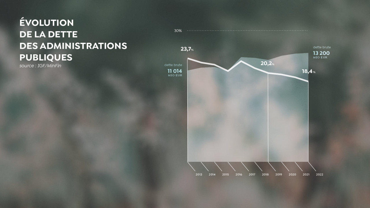 D’Staatschold louch 2018 bei 21,4% - wat schonn eng nette Baisse par rapport zu 2013 war. Enn 2019 wäert se bei 20,2% leien an trotz den héijen Investissementer wäert se bis d'Joer 2022 weider erof op 18,4% vum PIB goen.