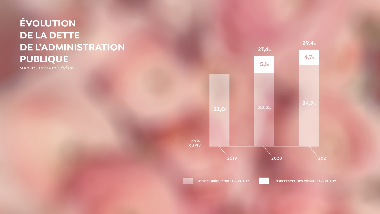 2020 leit d'Schold bei 16,2 Milliarden Euro oder 27,4% vum PIB. Wann een do awer déi 3 Milliarden erausrechnen, déi d'Chamber fir de Finanzement vun de Covid-Mesuren autoriséiert huet, wieren et just nach 13,2 Milliarden, oder 22,3%.
