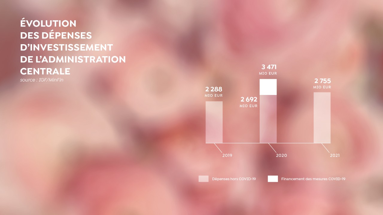 Fir 2021 sinn Investissementer an der Héicht vun 2,8 Milliarden virgesinn, wat 4,3% vum PIB entsprécht. Dese Montant läit also nach iwwert deem vun 2020, wann een déi extraordinär Investissementer erausrechent.