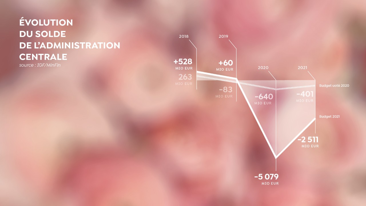 2018, also zwee Joer virun der Kris, huet d’Administration centrale mat engem Iwwerschoss vun +528 Milliounen Euro ofgeschloss. 2019 hat d’Administratioun e positive Solde vu +60 Milliounen Euro. Am Hibléck op de substanziellen finanziellen Impakt vun der Pandémie, hate mer also eng gutt Ausgangspositioun.