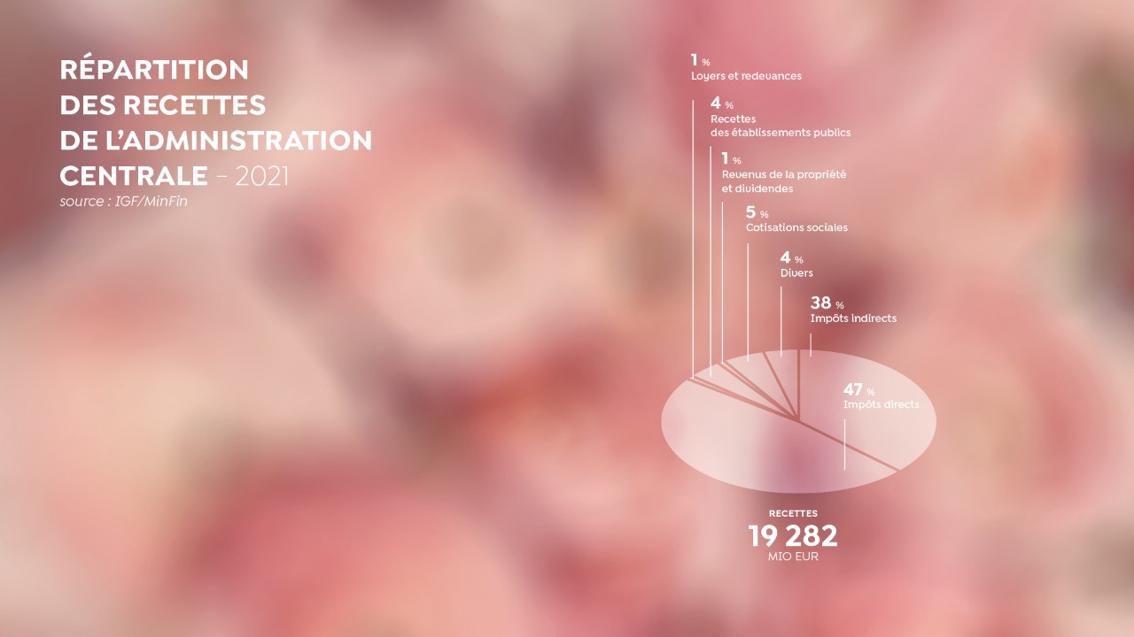 Déi gréissten Recetten fir 2021 sinn wéi gewinnt, d’direkt Steieren. 2021 ginn déi op ronn 9 Milliarden geschat, also 47% vun all den Recetten vun der Administration centrale.