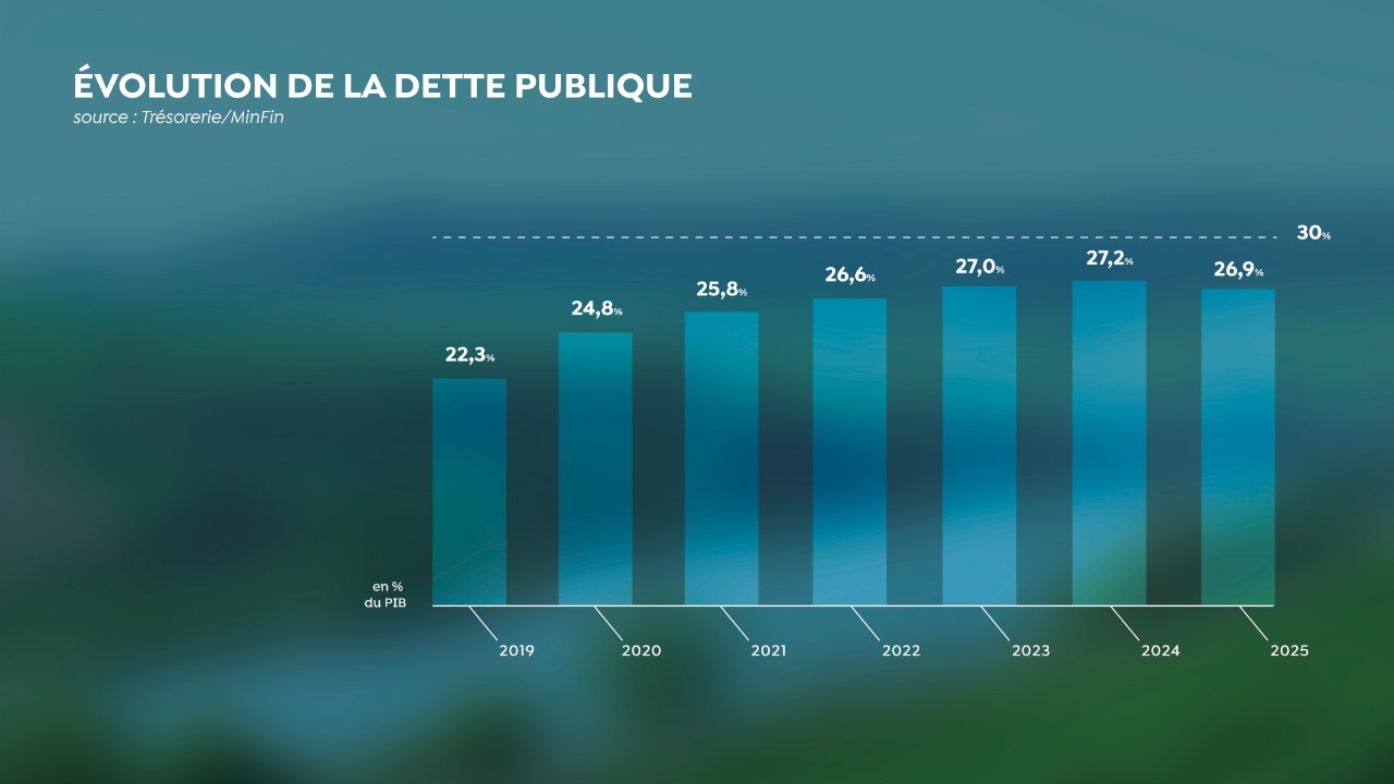 Laut de Prognosen vum Budget, soll d’lëtzebuerger Dette publique Enn 2022 bei 26,6% vum PIB leien, di Joeren drop ëmmer nees liicht ronderëm 27% fluktuéieren an domat ënner 30%.