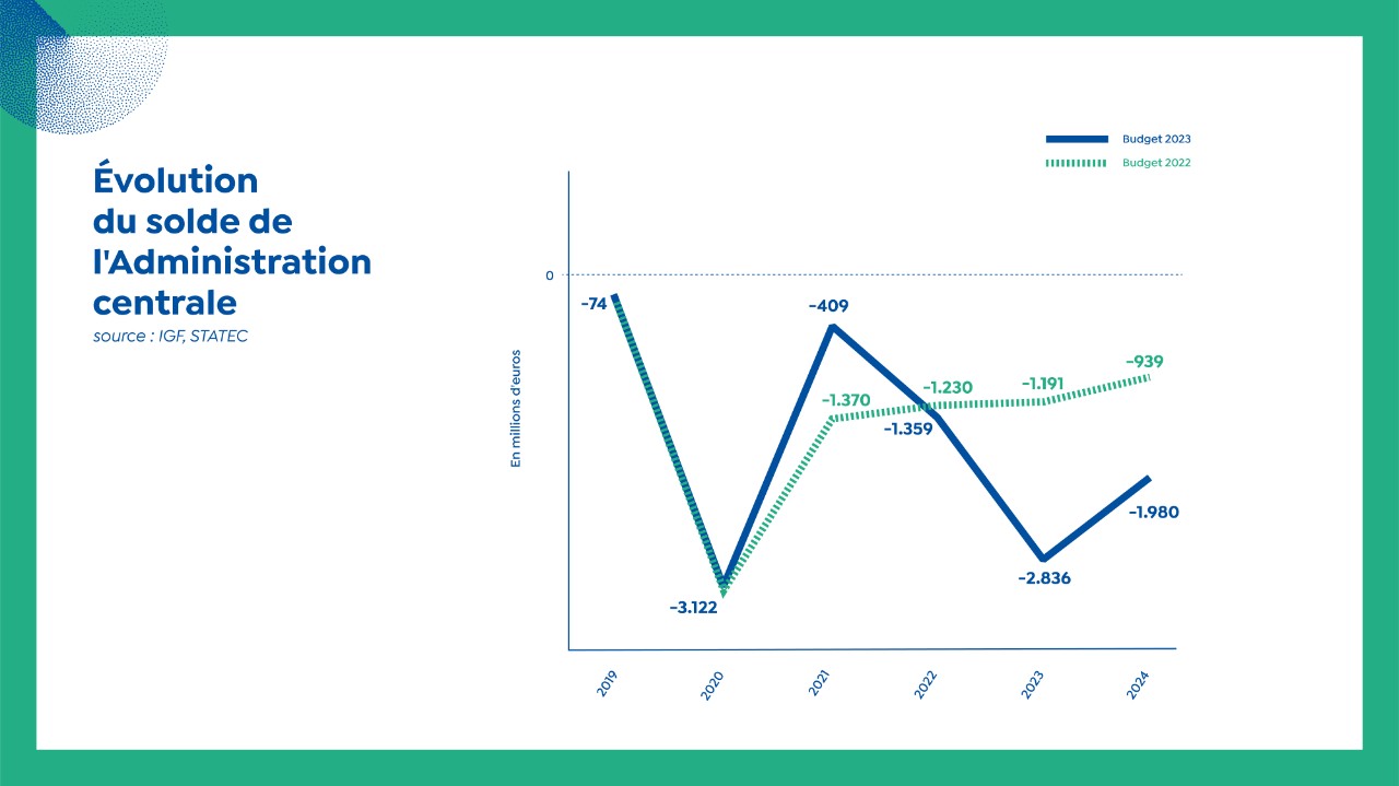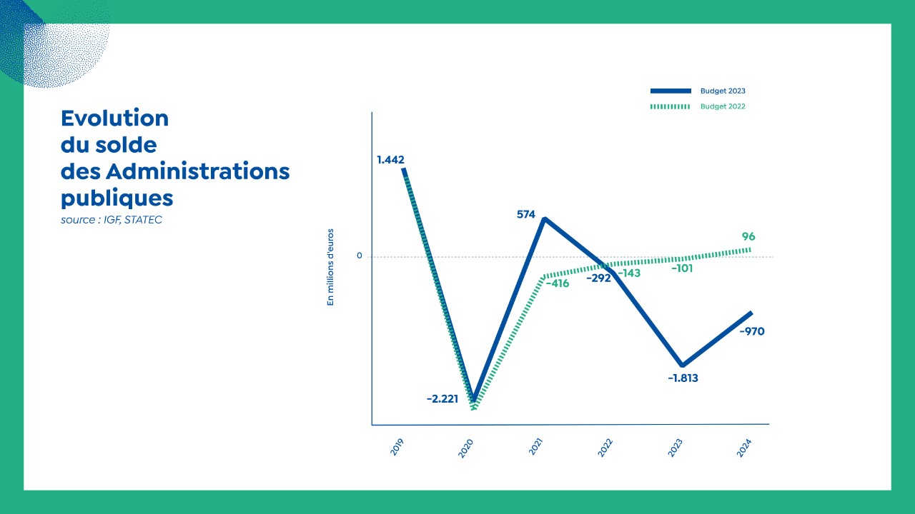 Am Gesamtstaat, deen den Total vum Zentralstaat, de Gemengen an der Sécurité sociale duerstellt, gëtt fir 2023 mat engem Defizit vun 1,8 Milliarden gerechent. Hei wäert sech de Solde d'Joren duerno progressiv verbesseren.