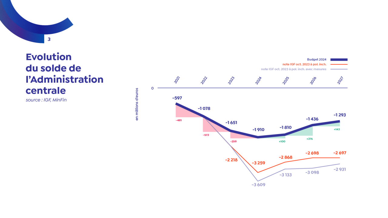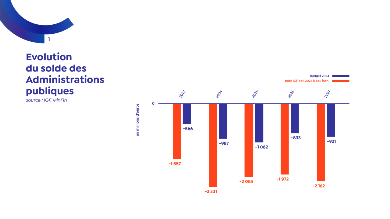 Am Zentralstaat gëtt fir 2024 mat engem Defizit vun 1,9 Milliarden Euro gerechent. Dat ass eng Verbesserung vu ronn 1,7 Milliarden am Verglach zu der Nott un de Formateur vun der Inspection générale des finances (IGF).